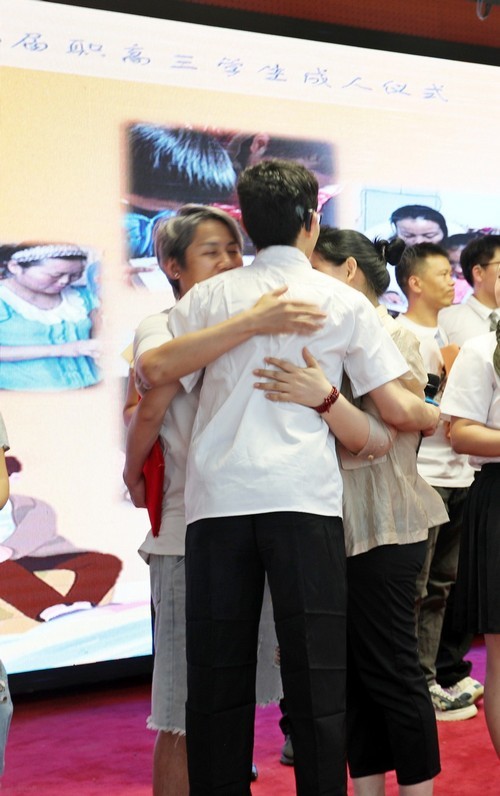主持人邀请所有家长上台,孩子们为爸爸妈妈送上鲜花,亲子交换信件,并深情拥抱。全体高三老师和历任班主任为同学们送上毕业寄语。同学们再一次聆听老师们满怀期待的叮咛与祝福。