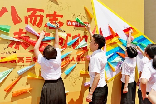 在来宾、老师、家长满含期待的目光中,同学们神采奕奕地走过十八岁成人门,在签名墙贴上满载梦想的纸飞机,郑重签下自己的名字。站在十八岁的门口,回首少年的青葱稚嫩,远眺未来的无限可能。