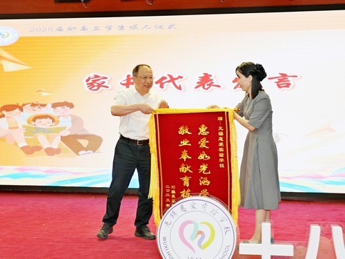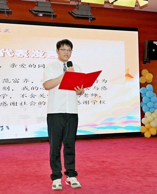 范富齐同学代表全体高三学生表达对社会、学校、老师、同学和家人朋友的感谢。刘栋昊妈妈代表全体家长,向学校和老师表达最诚挚的感谢,向孩子们送上最热烈的祝贺,并为学校送上锦旗。