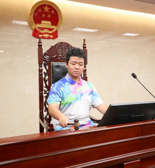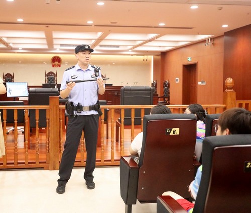 在随后开启的沉浸式参观体验中,大家首先走进刑事专用法庭,听张亚静法官细致讲解了法庭的功能分区与设置规范,又走进审判区,当了一回“小法官”。同学们依次走上法台,坐在审判长的椅子上,敲击法槌,并用口语或者手语庄严地宣布“现在开庭”,领悟一“槌”定音的含义。紧接着,孙迅警官带来单警装备演示,手铐、戒具、催泪喷雾器、伸缩警棍等装备逐一亮相,他详细介绍了各类装备的用途与使用规范,让同学们对司法警察的职责与保障司法安全的重要性有了更深理解。