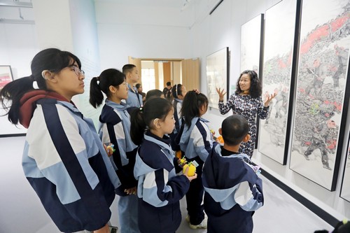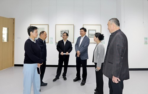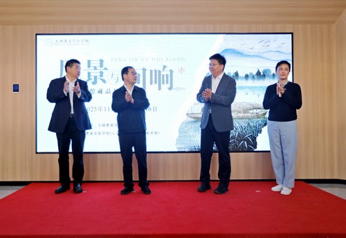 开馆首展“风景与回响”由无锡美术馆协办,展览秉持无障碍理念,通过多感官设计让艺术不仅可观,而且可听、可触:观众走近画作一米内即可触发语音导览,每幅作品下方均配有3D打印肌理图。观展现场,师生代表专注观展,视障学生在教师与志愿者的引导下,聆听讲解、触摸肌理,在声与触的交融中沉浸式感受艺术的温度与魅力。