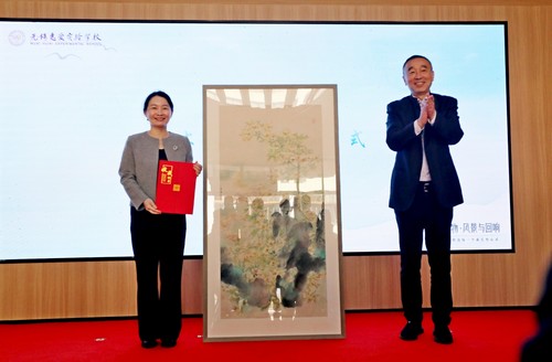 开馆仪式上,多项重要合作同步落地。无锡美术馆馆长顾真真与惠爱实验学校校长康立为共同签署“心艺工坊”美育浸润课程合作协议,并举行美术作品捐赠仪式。顾真真馆长向学校捐赠其工笔重彩力作《黄金决明》,作品以金灿灿的决明花与水韵江南相映,象征传统与时代的交融,将成为学生美育课程的珍贵资源。学校为顾馆长颁发收藏证书,以表衷心感谢。