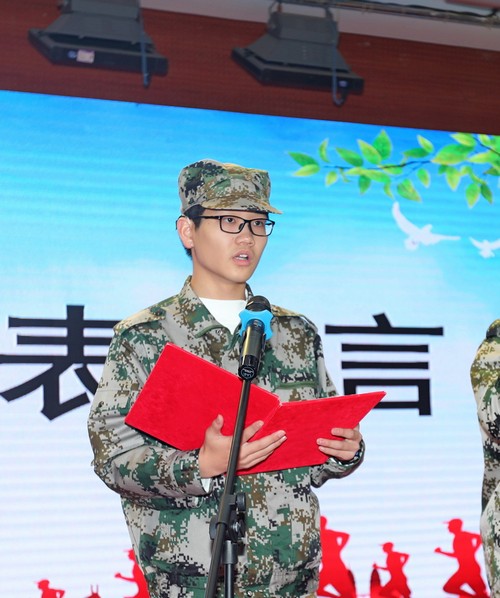 学生代表以“少年强则国强”为引,向全体教官致以诚挚谢意,并代表参训同学郑重倡议:以勇气迎接挑战,以行动致敬榜样,以纪律守护集体,在军训中磨练意志、强健体魄,展现惠爱学子自强不息的精神风貌。