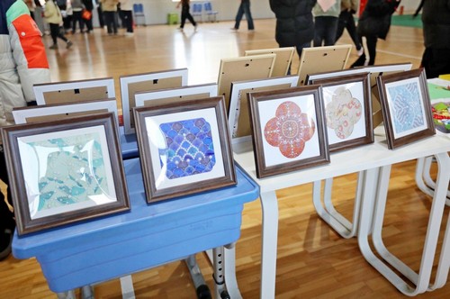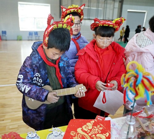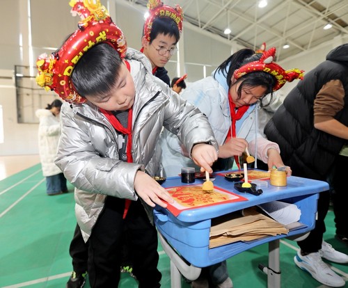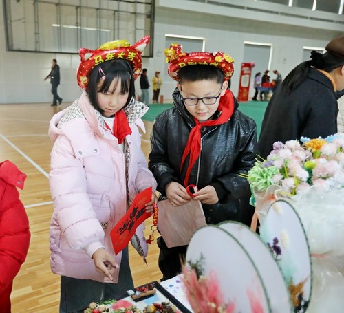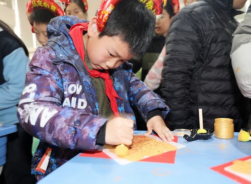 “新年拓印”区,孩子们亲手蘸取彩墨,铺纸轻拓,一幅幅充满年味的图案跃然纸上。