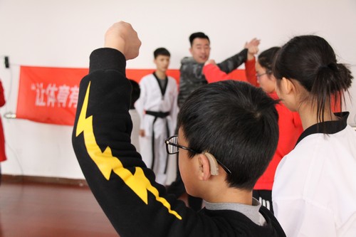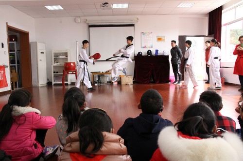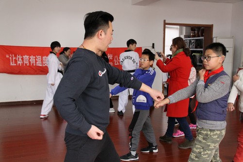 王教练和他的学生们与四五年级的学生们进行了跆拳道的技能交流。课堂上孩子们看着哥哥姐姐们表演跆拳道,个个跃跃欲试,跟着王教练学动作时,个个虎虎生威,“哈!”“哈!“地吼声,整齐有力。王教练耐心地给每个孩子示范、纠正动作,孩子们学得也非常认真,即使休息之余,都在不断的练习。窗外很冷,但是教室里却因为这样的一场活动课而变得温暖起来,欢乐起来。。。。。。