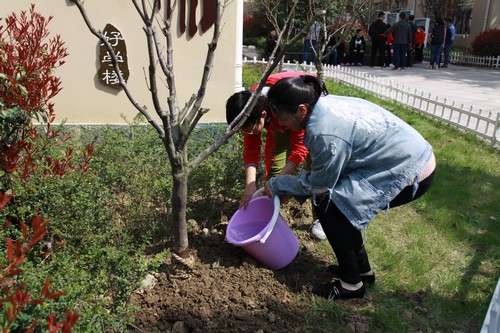 在接下来的植树活动中,大手拉小手,挖坑、种树、填土、浇水……大小朋友们配合默契,虽然累得满头大汗,但是所有人的的脸上都洋溢着喜悦的神情!