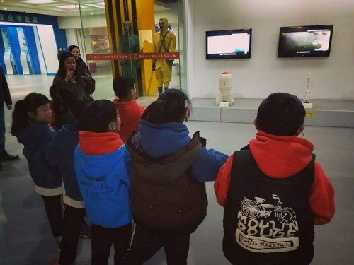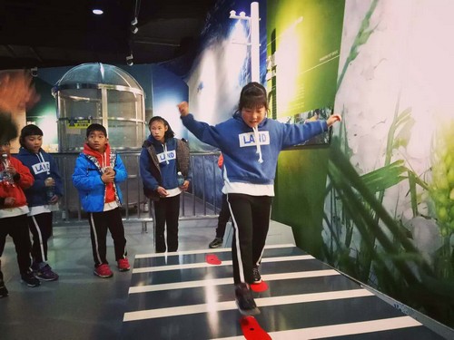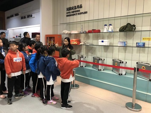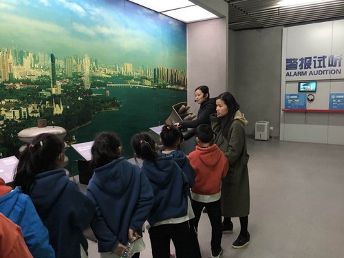第二站,孩子们来到了无锡市民防科普教育体验馆。在这里孩子们先后参观了人民防空、核生化知识、气象灾害、交通安全、地震体验、消防安全和民防进社区8个展区。在气象灾害展区,孩子们身临其境般地感受洪水、雪灾、暴风雨等自然灾害,跨步电压体验、触电体验展项,通过亲身的互动参与,学习防护与自救技能。在交通安全展区,孩子们通过游戏体验的方式 “模拟过马路”,“过马路要走斑马线,红灯停,绿灯行”,每位小朋友经过这个模拟场景都遵守交通规则。