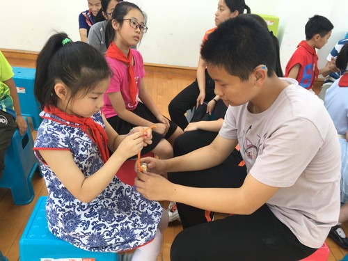 时间过得真快!不觉得,大家满头大汗。于是,我们坐下来边休息边相互交流。此时,小朋友们已经没了先前的拘束,大家打的一片火热。大家在一起共同做了乒乓球的手工艺品,作为回报,特校的同学也教了小朋友一些常用的手语。大家你来我往,其乐融融!