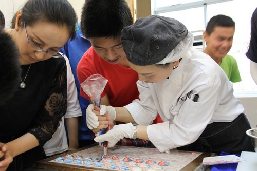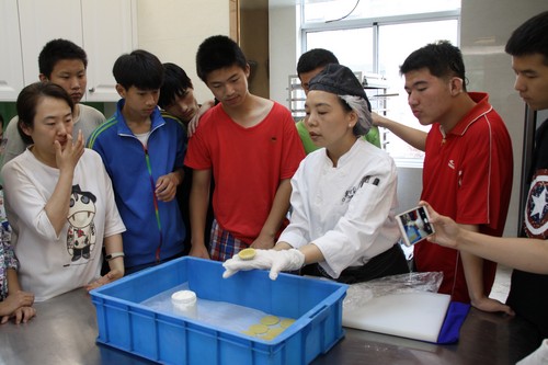 在整个烘焙过程中,同学们忙不迭地看呀,学呀,做呀,记呀。手里感受着面皮的软糯,脑子里记着糖水的温度,鼻子里嗅着黄油的香甜。还没出烤箱呢,同学们就大呼:“受不了了!受不了了!太香了!太香了!好想快点尝到自己做的成品啊!”